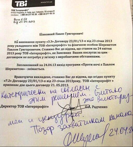 Власник ТВі Костянтин Кагаловський заявляє про рейдерське захоплення телеканалу і стверджує, що не підписував ніякі папери про продаж телеканалу, документи підроблені. "Канал я не продав і продавати не збирався", - сказав К.Кагаловскій на прес-конференції 23 квітня.