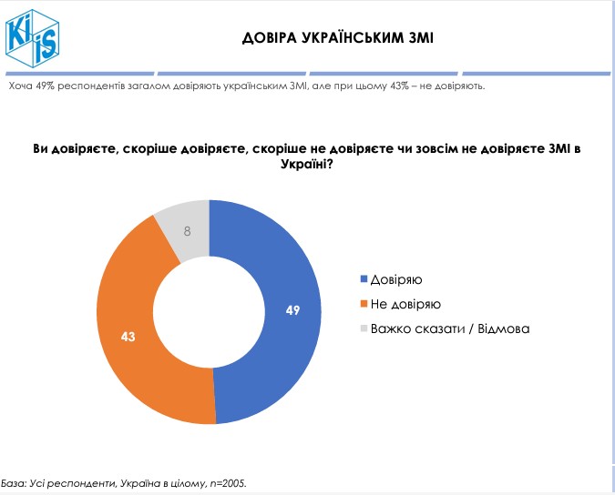 Водночас українським ЗМІ довіряють 49% респондентів, не довіряють 43%. Помітно критичніші до українських ЗМІ мешканці сходу, де лише 19% довіряють їм (в інших регіонах – 43–59%).