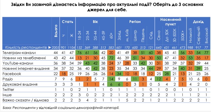Використання інтернет-джерел поширене серед усіх вікових категорій і фактично домінує у всіх вікових категоріях 18–59 років. Проте серед респондентів віком 60+ досі домінує телебачення (72%), хоча багато хто користується і телеграмом, і ютубом, і новинними інтернет-сайтами.