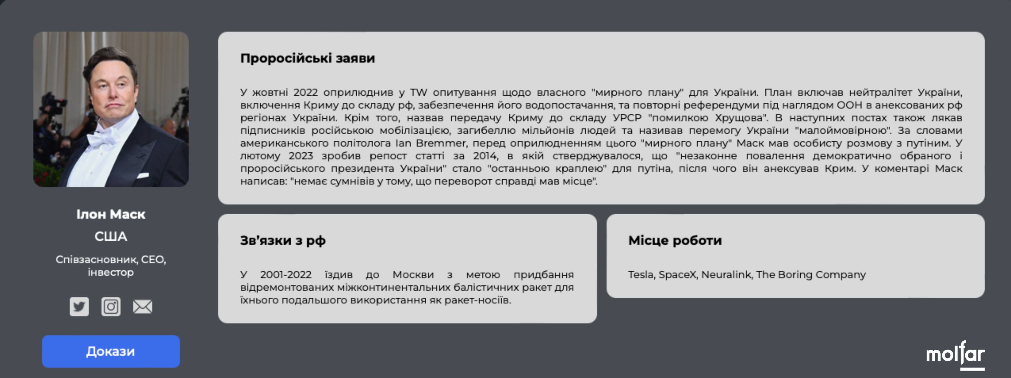 OSINT-спільнота Molfar додала Маска до бази російських пропагандистів