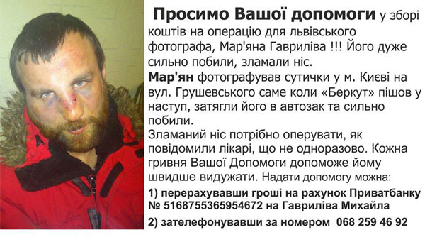 Нагадаємо, 22 січня силовики затримали у Києві львівського фотографа-фрілансера Мар’яна Гавриліва. Він знімав сутички на вулиці Грушевського, коли "Беркут" пішов у наступ. Мар’ян Гаврилів потрапив під обстріли, після чого його і багатьох інших чоловіків, що були поруч, схопили і кинули до автозаків. Їх повезли за місто, в невідомому напрямку, – начебто в поле, там роздягли до пояса, били ногами і кидали в сніг.
