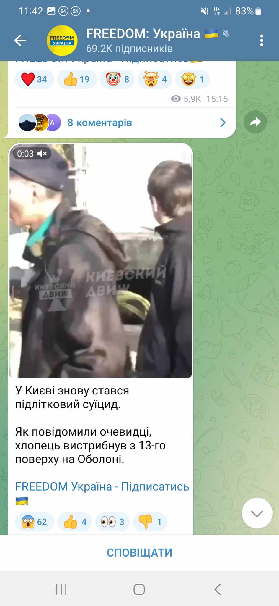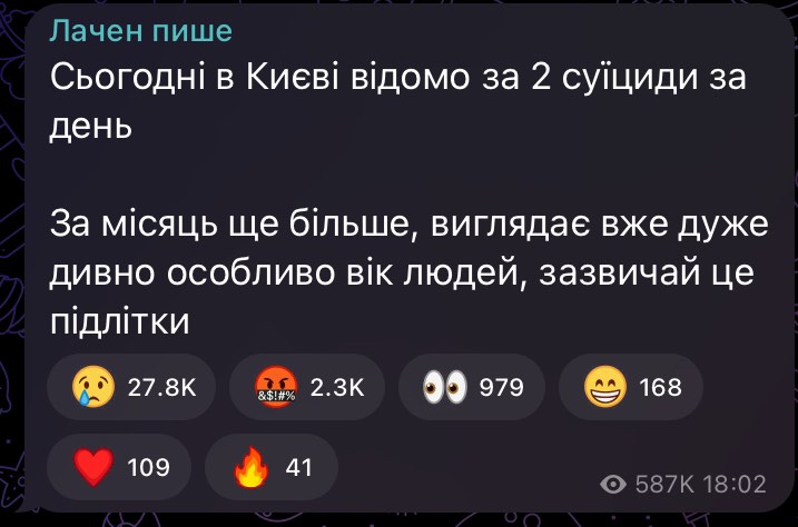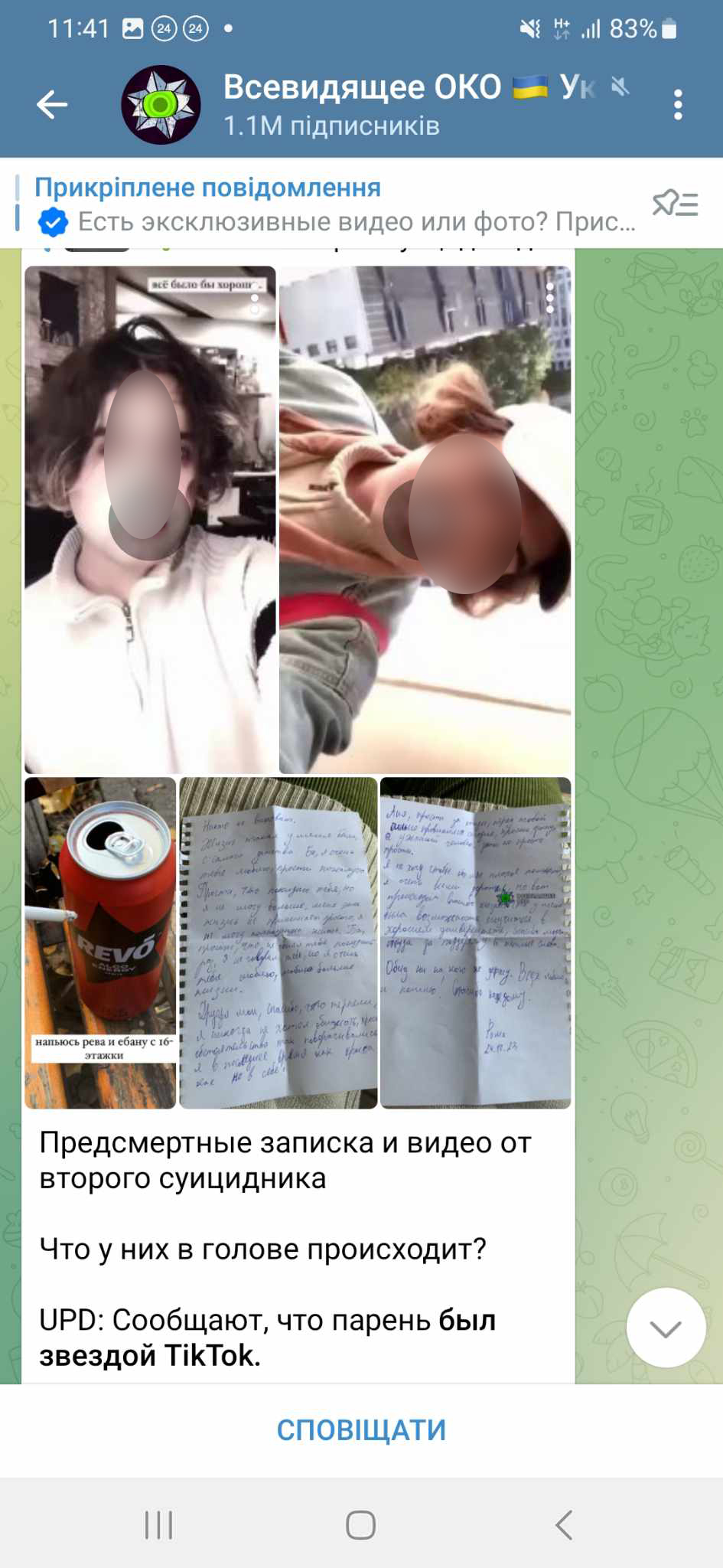 Нагадаємо, інформацію про самогубства підлітків 24 жовтня поширили, зокрема, телеграм-канали “Киевский Движ”, “Всевидящее Око”, “Freedom: Україна”, “Лачен пише”.