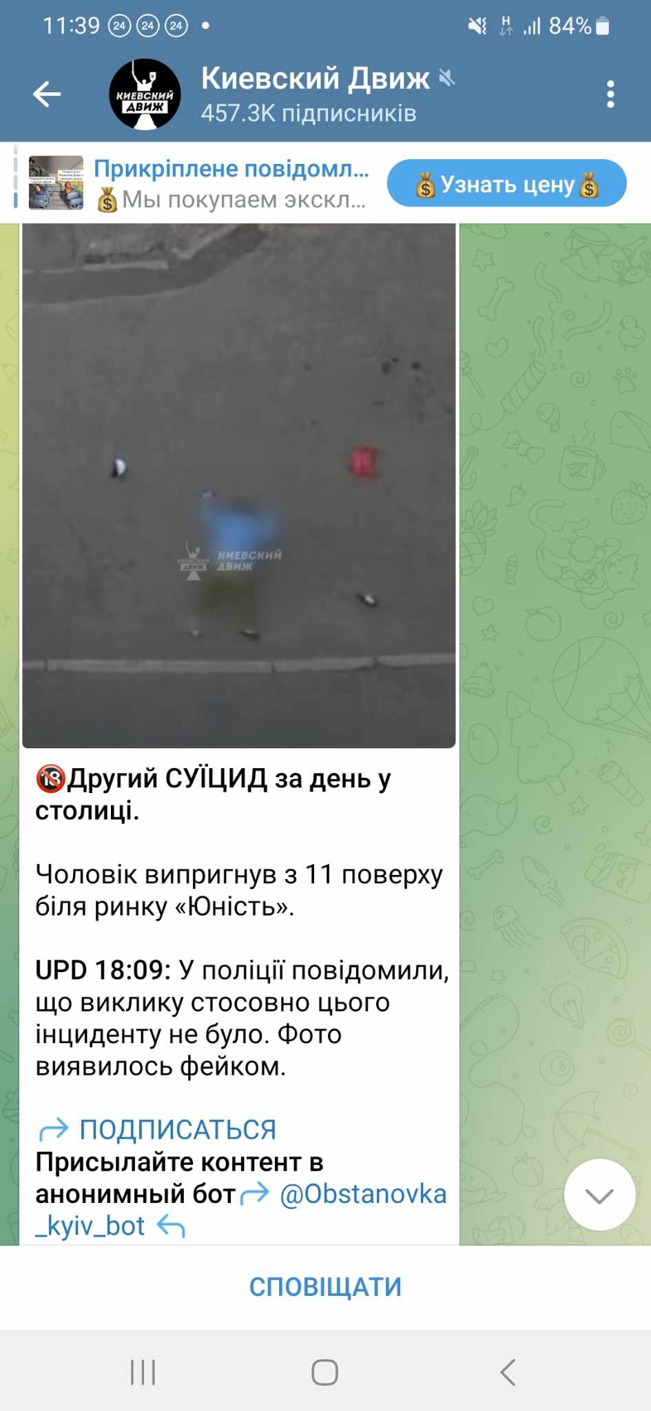Телеграм-канали, зокрема, писали про суїцид біля ринку Юність, на Оболоні тощо.