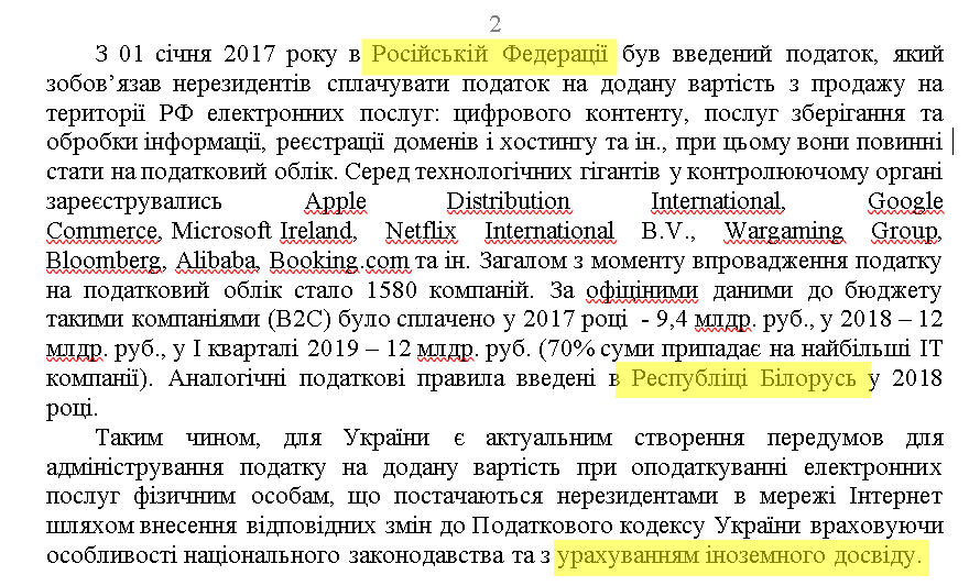 Документ, зокрема, передбачає, що міжнародні компанії, які діють в інформаційному просторі України та заробляють на мережевій рекламі, платитимуть податки в Україні, зокрема ПДВ.