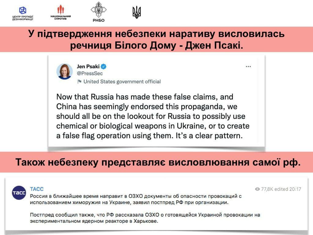 За інформацією ЦПД, цей тренд з’явився ще в грудні 2021 року, але не набув масового поширення. "Станом на 10 березня він стає все більш небезпечним, ймовірно передуючи реальним злочинам окупантів та подальшому звинуваченню України у використанні біологічної чи хімічної зброї проти власного народу. У підтвердження цього висловилась речниця Білого Дому Джен Псакі", – повідомили в Центрі.