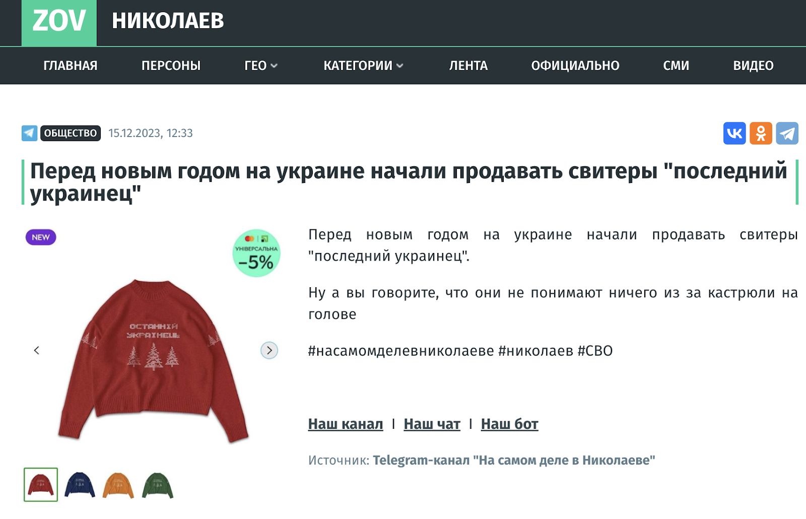 Російська пропаганда поширює фейк, що в Україні продають новорічні светри "Останній українець"
