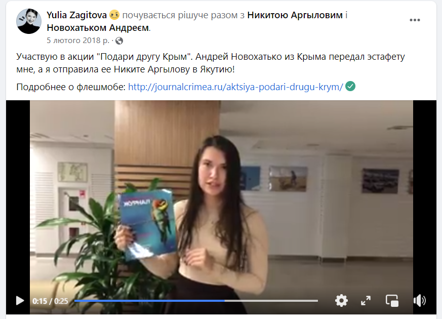 Скріншот з сайту АиФ- порушниця державного кордону України Юлія Загітова, секретарка "союзу журналістів Росії", яка публічно виставляє фотографії своїх числених візитів до анексованого Криму на власній сторінці Фейсбук: