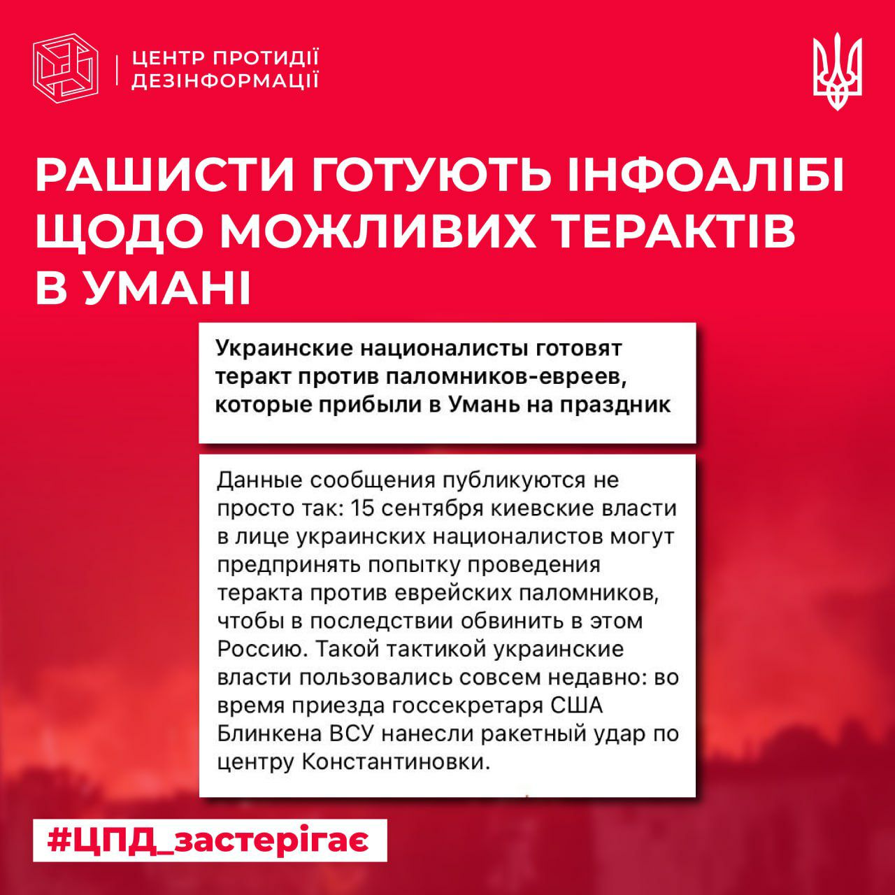 Як зазначає центр, пропагандисти пишуть, що після теракту українська сторона начебто планує звинуватити росію в “злочинах проти людяності”.