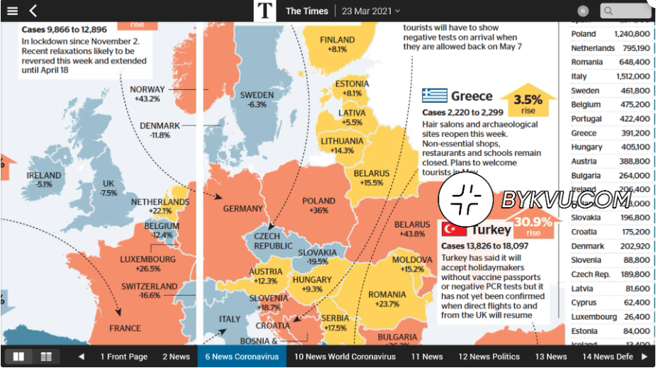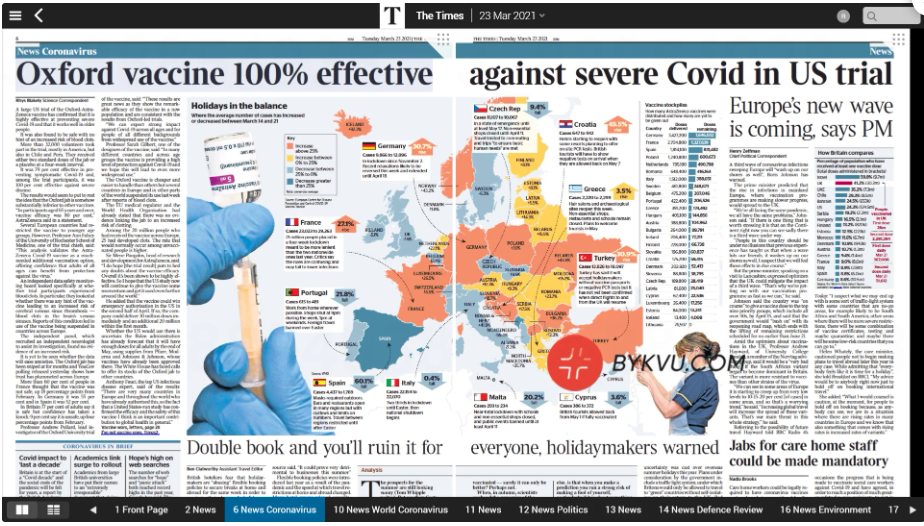 На розвороті, присвяченому новинам про коронавірусну хворобу, можна побачити мапу Європи, розфарбовану у відтінках синього, жовтого та червоного (залежно від темпів зростання захворюваності).