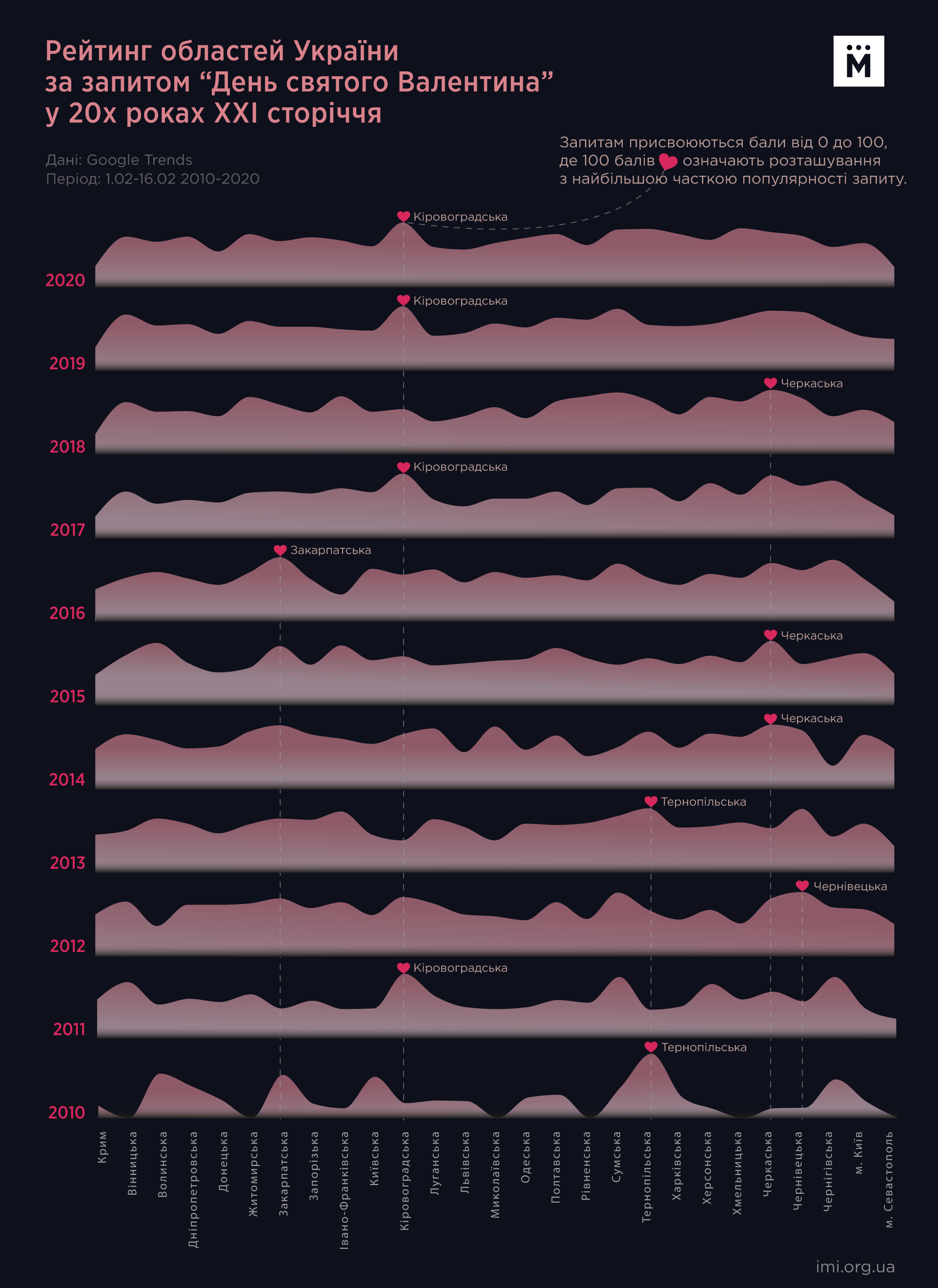 Для аналізу було обрано дані за період з 1 лютого 2010 по 16 лютого 2020 років. Ключові слова - “День (Святого) Валентина”. Охоплення - усі регіони України, плюс Київ та Севастополь як окремі адміністративні одиниці. Google присвоює запитам бали від 0 до 100, де 100 балів означають найбільшу частку популярності запиту, і пропорційно до цього, 50 балів - рівень популярності запиту вдвічі нижче, і т.п. Чим більше балів, тим вище частка популярності запиту в окремому регіоні, серед всіх інших запитів.