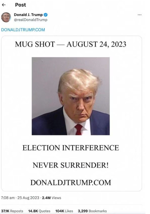 Колишній президент США Дональд Трамп повернувся в соцмережу "Х", раніше відому як Twitter, й опублікував своє фото, яке зробили поліцейські, оформлюючи його у в'язниці округу Фалтон, штат Джорджія.