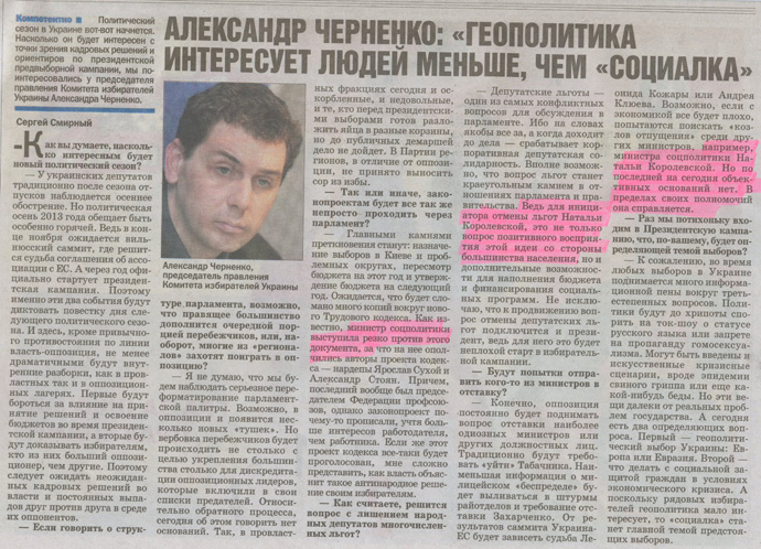 У вівторковому номері газети «Сегодня» (№185 від 27 серпня 2013 р.) опубліковано інтерв’ю голови Комітету виборців України Олександра Черненка під заголовком «Александр Черненко: «Геополитика интересует людей меньше, чем «социалка»». Інтерв’ю подане під рубрикою «Анонс», котра входить до переліку рубрик, у яких «Сегодня» друкує матеріали на правах реклами (що не відповідає вимогам рекламного законодавства України).