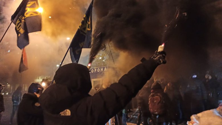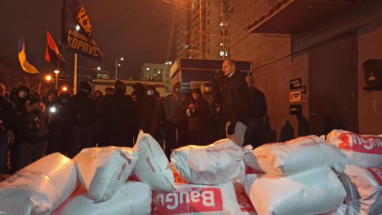 Як повідомляє Big Kyiv, учасники акції запалили фаєри, а також намалювали фарбою написи біля входу на телеканал: “Де санкції?”, “Ганьба”, “Сепари” тощо. Також активісти поклали біля входу мішки, назвавши це “барикадою від російських інформаційних військ”.