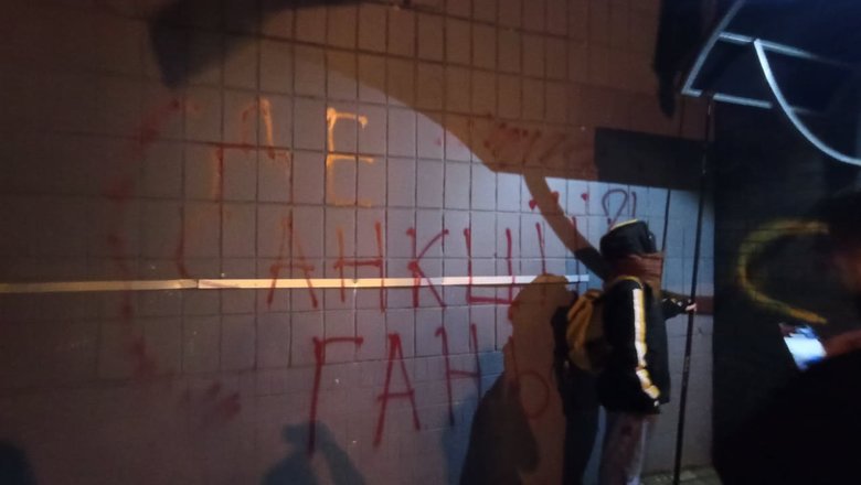Учасники звинуватили телеканал в антиукраїнській пропаганді в інтересах РФ. Вони наклеїли символіку армії РФ на банер телеканалу “Наш”, створили біля входу символічний блокпост, облили вхід до каналу червоною фарбою.
