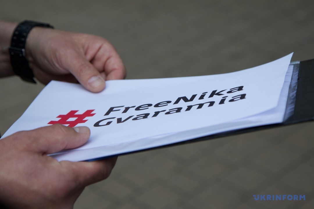 Лист-звернення до президентки Грузії Саломе Зурабішвілі із закликом звільнити Гварамію учасникам акції зачитав, а потім передав працівникам грузинського посольства ведучий Радіо NV, член Незалежної медійної ради і Медіаруху Дмитро Тузов.