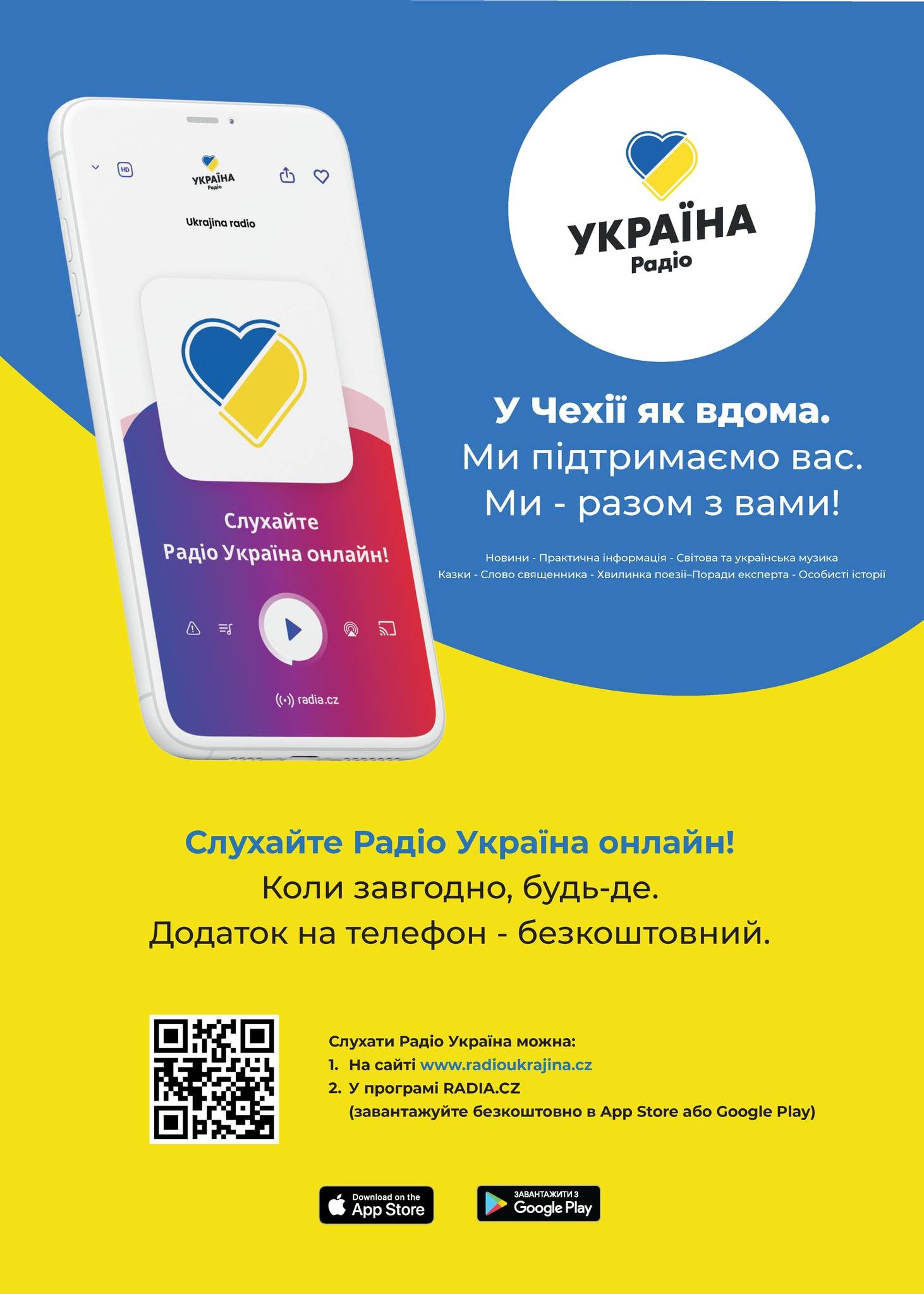 Радіо є повністю українськомовним з лише українською музикою. Окрім української музики, радіоканал також готуватиме авторські програми, актуальні випуски новин з України та Чехії, інформуватиме про події, які можуть бути цікаві для українців у Чехії. Радіо також планує запустити серію консультаційних передач з різними експертами.