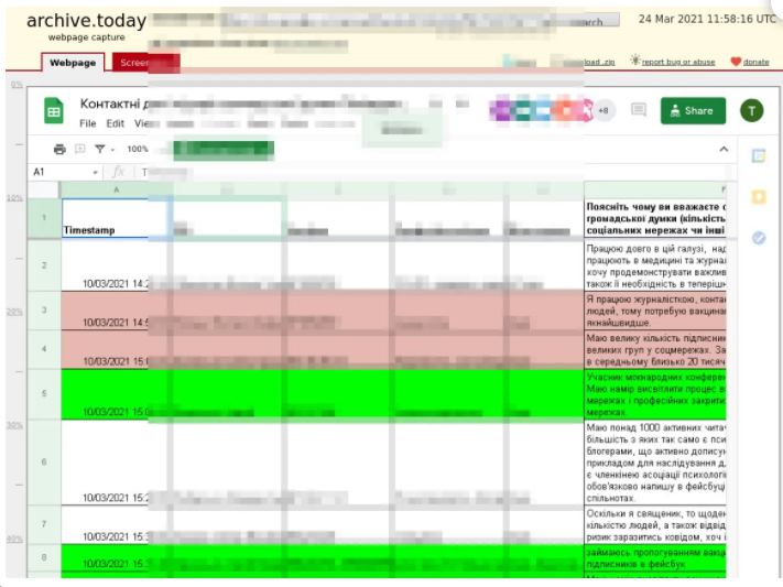 У видаленому дописі Мінветеранів для майже кожної області України було запропоновано документ, розміщений на Google Docs, куди можна вписати свої контактні дані (ПІБ, адреса, телефон).