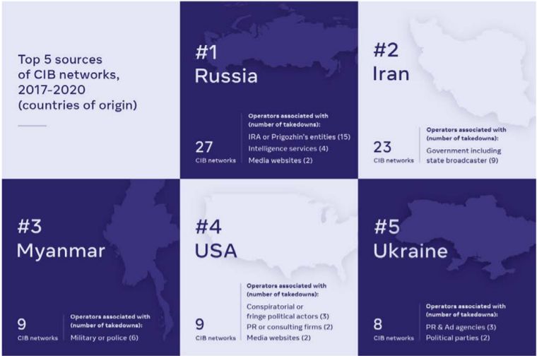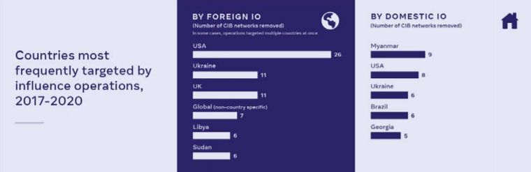 Окрім того, Україна ввійшла до переліку країн, які найчастіше ставали ціллю операцій впливу (IO), що у Facebook розуміють як “скоординовані зусилля для маніпулювання чи впливу на публічні обговорення задля стратегічної мети”.