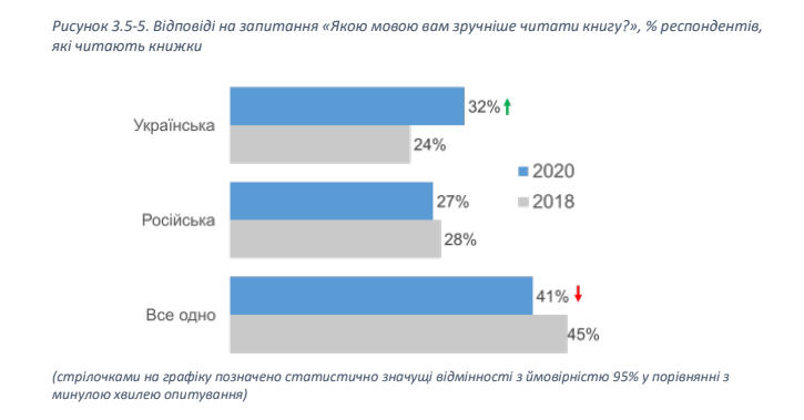 Дослідження показало, що вперше за часи незалежності України українські читачі почали віддавати перевагу саме українськомовним книжкам: 32% українською проти 27% російською.