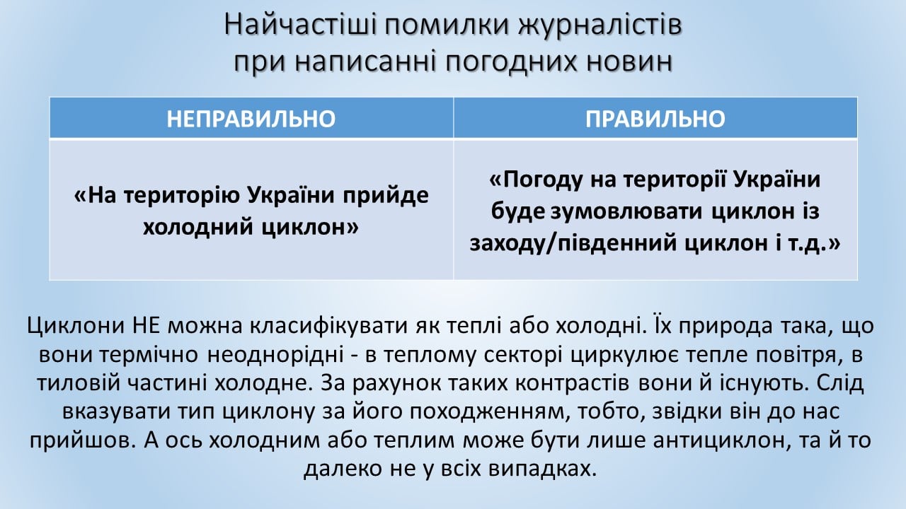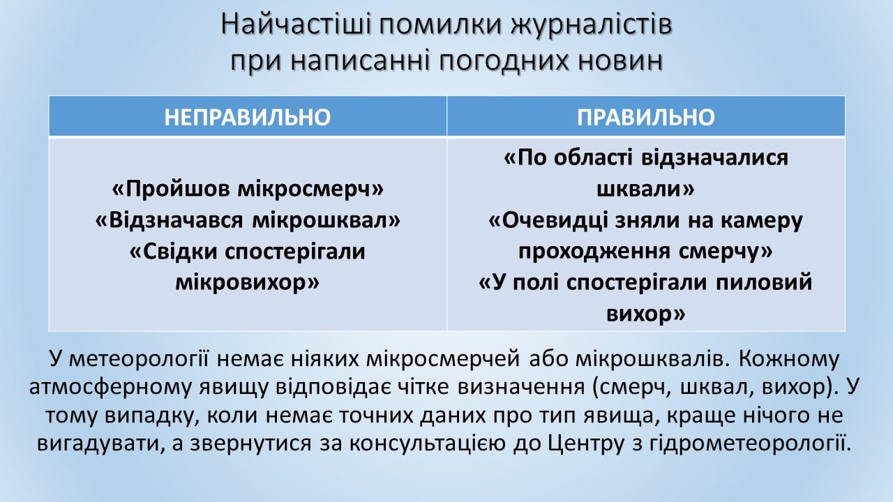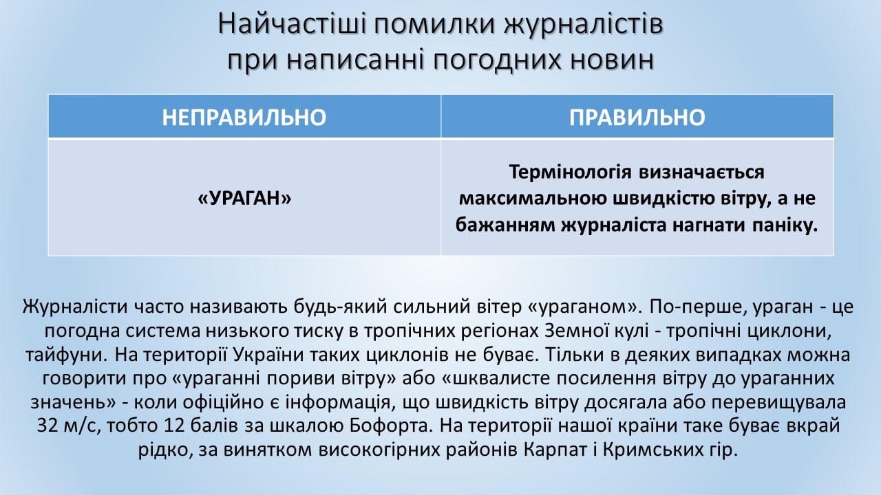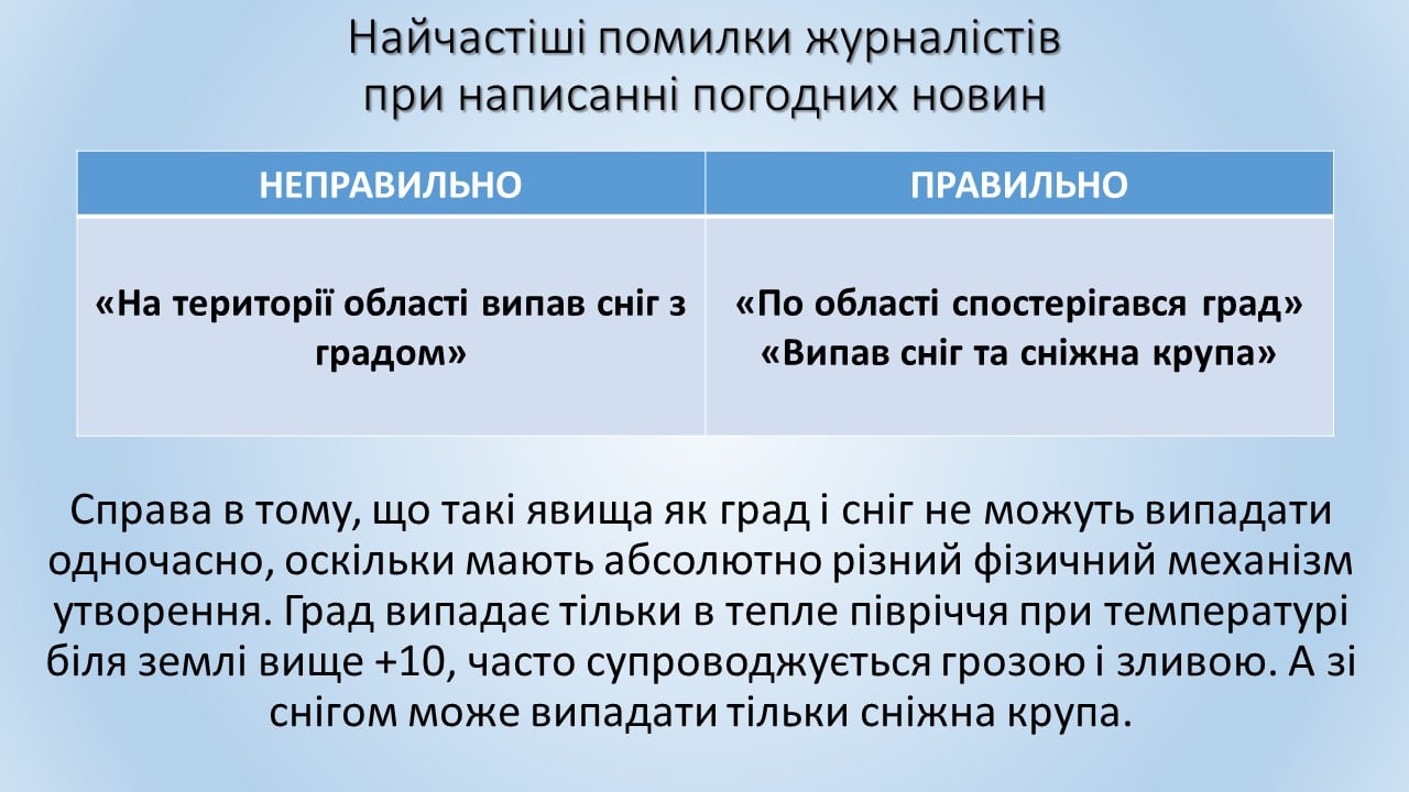 Український гідрометеорологічний центр зібрав найпоширеніші помилки журналістів та SMM-менеджерів інформаційних ресурсів при написанні погодних новин.