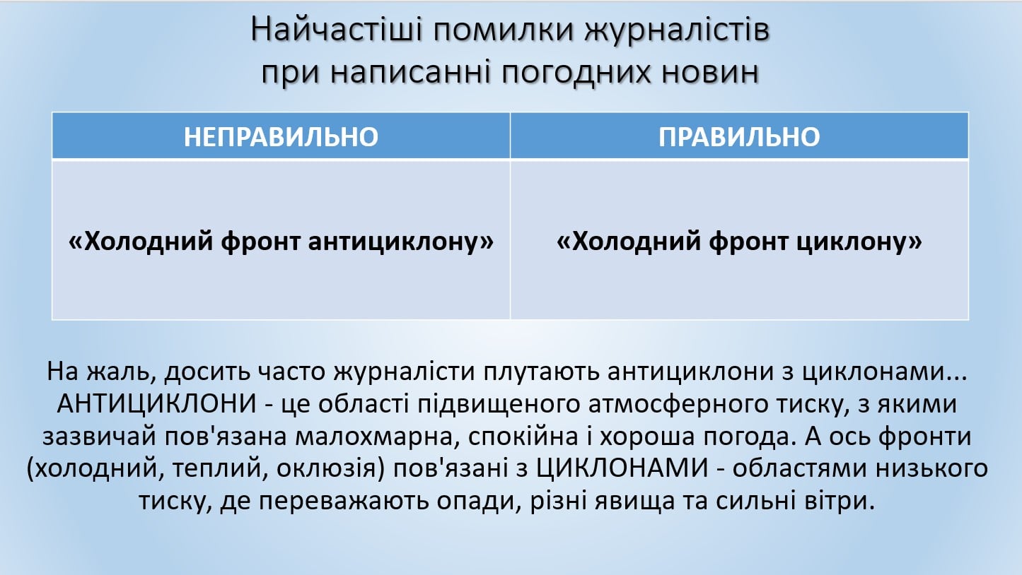 Також звертається увага на те, що журналісти часто плутають циклони з антициклонами.
