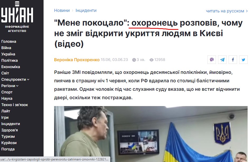 Станом на 11-ту годину 5 червня заголовок уже виправлено: "Мене покоцало": охоронець розповів, чому не зміг відкрити укриття людям в Києві (відео)".