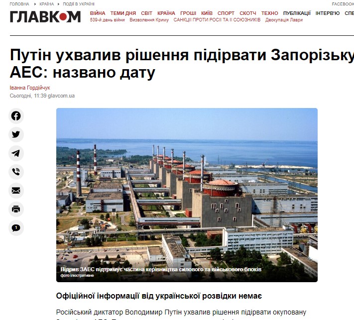 Як з'ясував ІМІ, інформацію про те, що президент РФ Володимира Путін ухвалив рішення підірвати ЗАЕС поширили ТСН та Главком.
