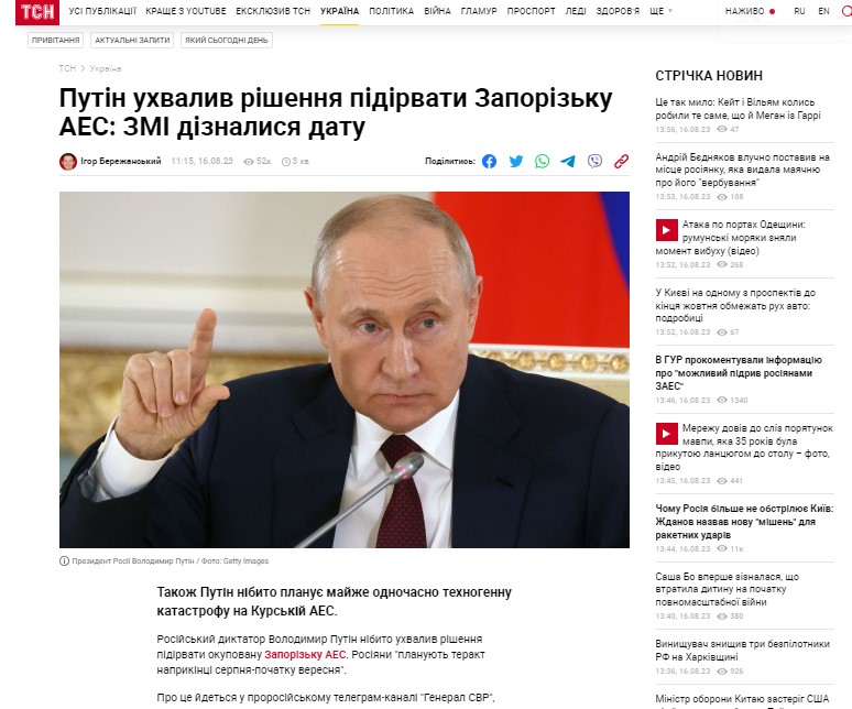 На ТСН інформація вийшла об 11:15, на Главкомі – об 11:39. Обидва медіа посилаються на анонімний російський телеграм-канал “Генерал СВР”. Цей телеграм-канал повідомив, що Путін “активував процес підготовки техногенної катастрофи” на Курській АЕС та Запорізькій АЕС. Реалізація цих планів, пише телеграм-канал, планується на кінець серпня – початок вересня. Також повідомляється, що ці плани Путіна підтримує частина керівництва силового та військового блоків і їх готують до реалізації.