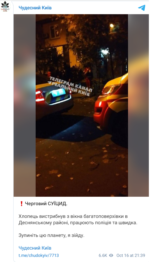 Місцеві засоби масової інформації Києва й Telegram-канали повідомили, що ввечері 16 жовтня в столиці сталося, ймовірно, чергове самогубство дитини. Однак поліція цю інформацію заперечує: подія була, але не за участю дитини.